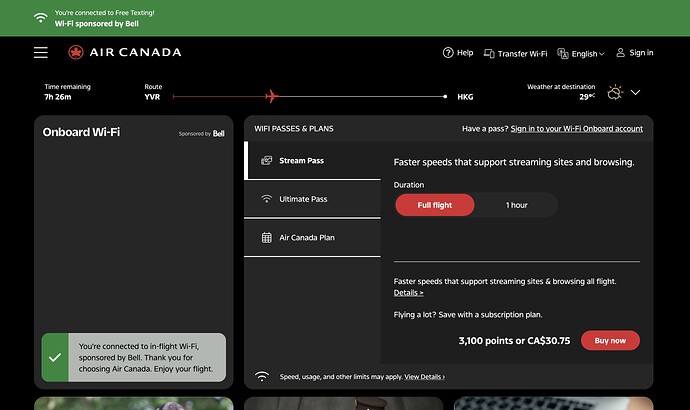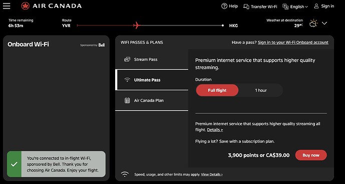 但是 Wifi 做了限制,对于Aeroplan的会员,如果未付费,就只提供 Free Texting 的功能,即只能使用即时通信软件,比如 Whatsapp, Snapchat,微信发送文本信息,但无法访问其他网站。