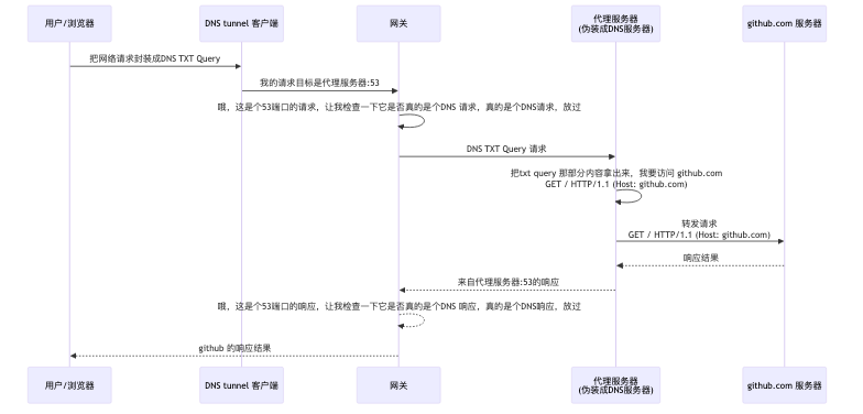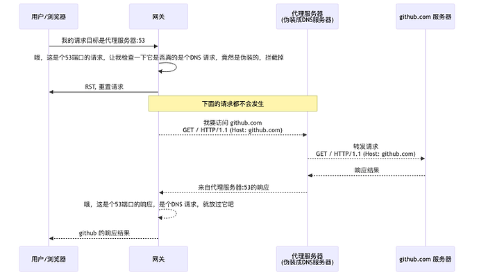 现在网关是只通过端口是否是53来判断是否是DNS请求, 但是如果网关更严格一些,比如检查DNS请求包的内容,就会发现我们的请求是「伪装」成DNS查询请求,而非真正的DNS查询请求: