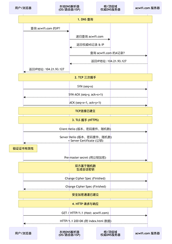 比如输入的是 https://acwifi.com, 如果只关注的网络请求部分,整个过程大概是:DNS查询 → TCP连接 → TLS握手 → HTTP请求与响应
