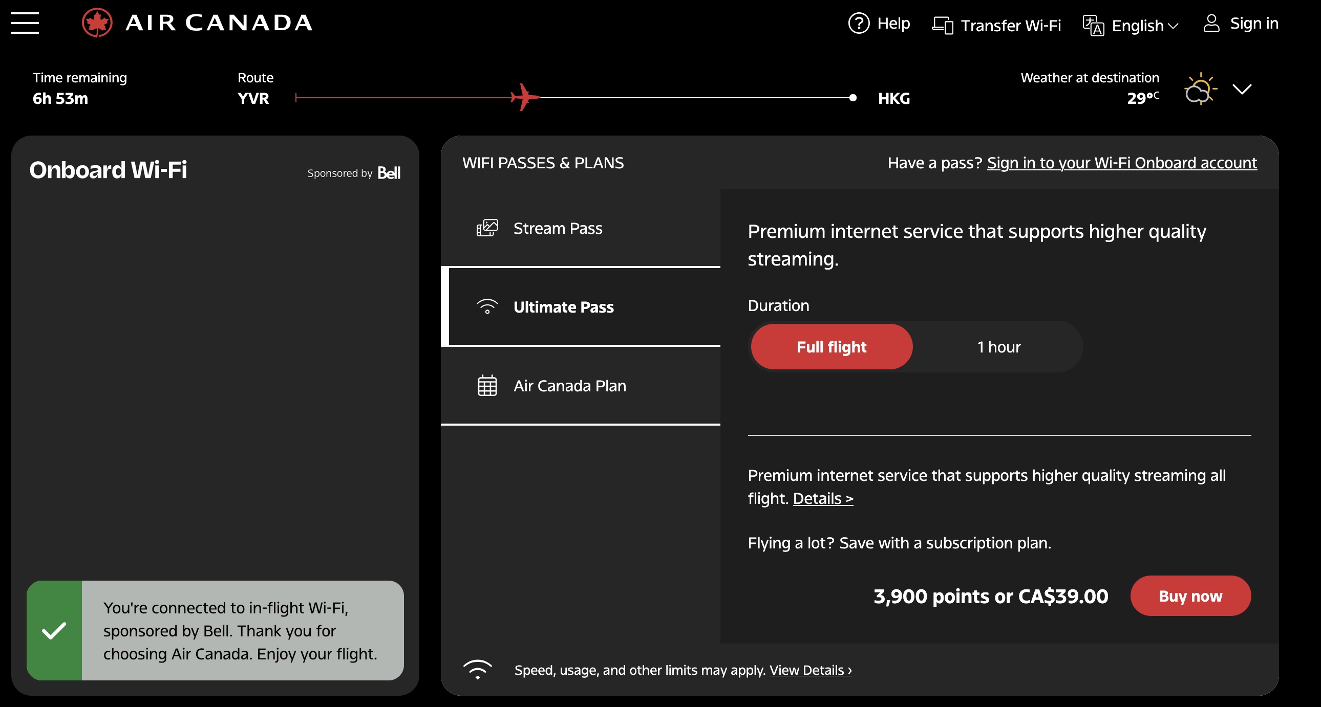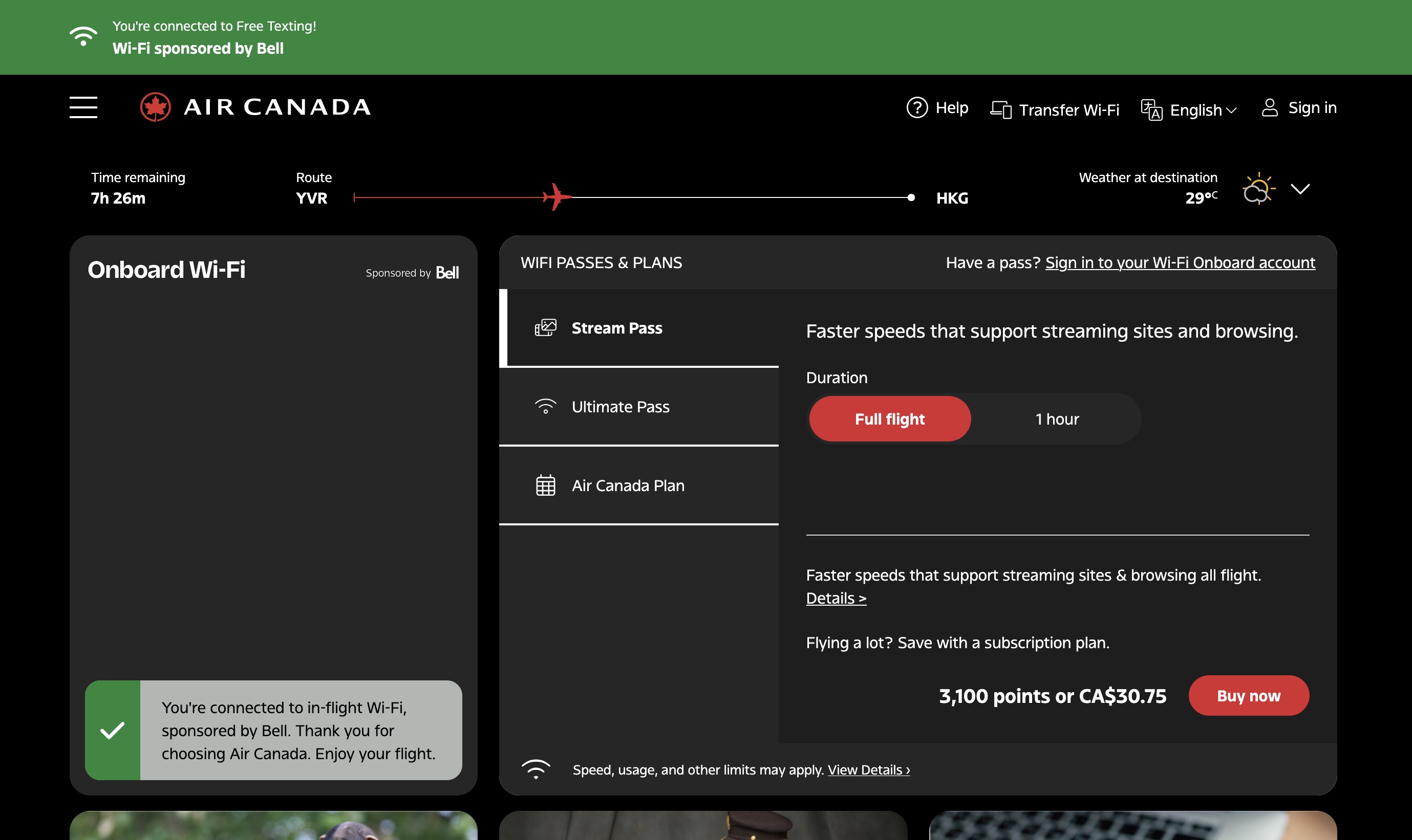即相当于还是免费会员,但是可以享受30.75加元付费用户的服务,反正长途漫漫,总要找点有趣的事情消磨一下12个小时的时间。