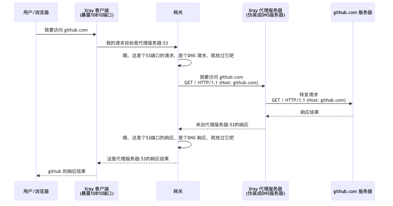 那么我们就有了个巧妙的想法:既然飞机网关对DNS请求没有拦截,那么理论上我们可以把代理服务器伪装成DNS服务器, 暴露DNS服务的53端口,所有的请求都经过代理服务器,伪装成 DNS 请求,那么就可以绕过拦截了。
